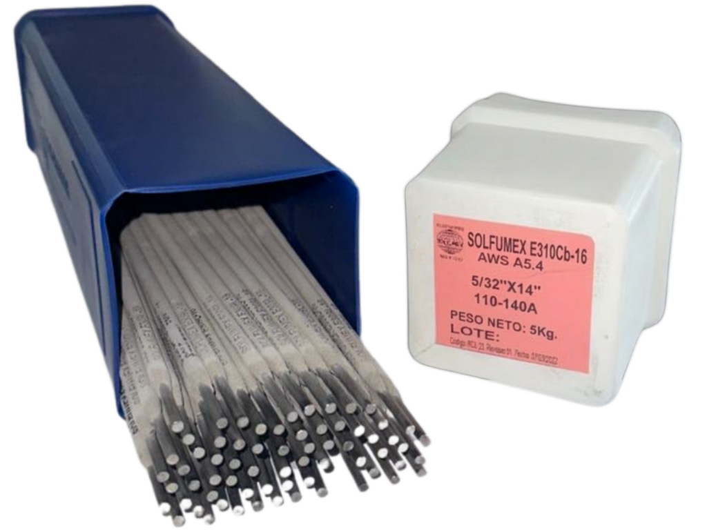 • SOLFUMEX E310Cb es un electrodo diseñado para soldar aceros inoxidables del tipo 25% Cr – 20% Ni o de composición química similar, así como para aceros inoxidables con aceros al carbono o de baja aleación. También puede emplearse como capa superficial para prevenir la corrosión en algunos aceros al carbono. Su contenido de Niobio reduce la susceptibilidad a la corrosión intergranular, incrementando la resistencia a la oxidación a altas temperaturas, hasta 1,200 °C. Es de fácil aplicación, excelente encendido y reencendido, la escoria se desprende fácilmente. Se puede aplicar en todas las posiciones con corriente continua.